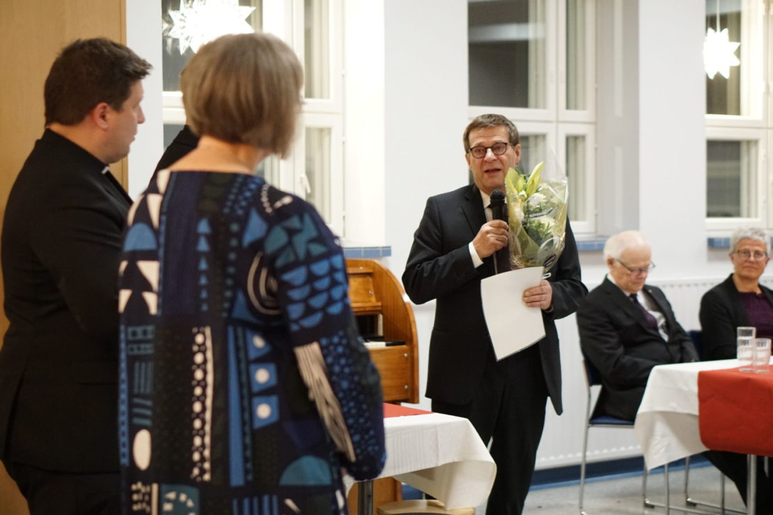 Kuva: Opiston jouluaterian yhteydessä Matti Jokitalo vastaanotti Suomen Kansanopistoyhdistyksen Kunniamerkin sitoutuneesta ja ansiokkaasta työstä Reisjärven kristillisen opiston johtokunnassa.
